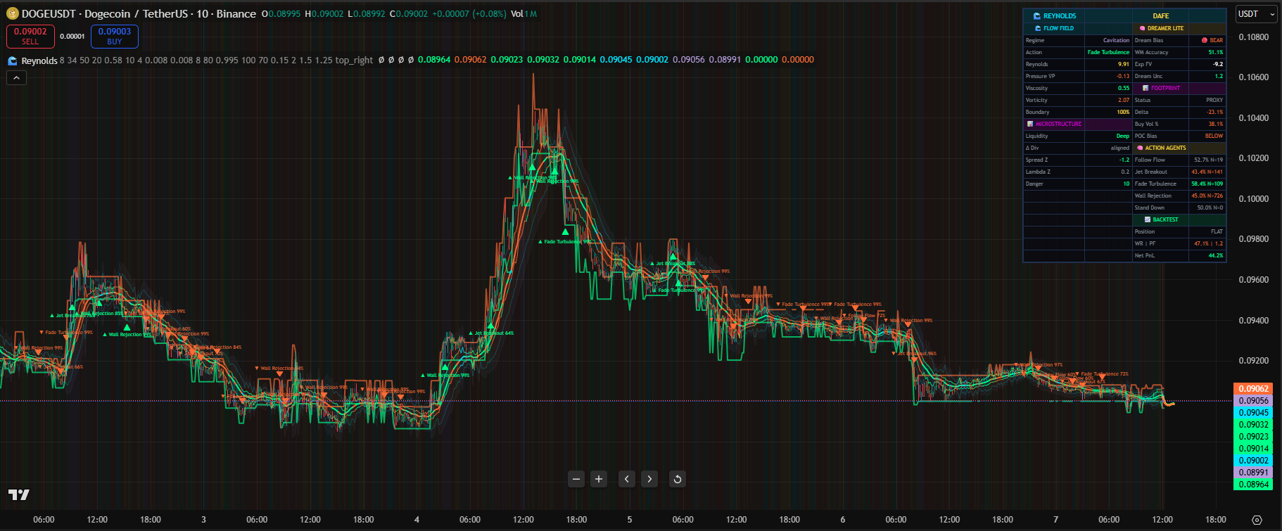 A fluid‑dynamics trading engine that models price as a live flow field—using velocity, pressure gradient, viscosity, vorticity, and a Reynolds‑style regime classifier—augmented by footprint confluence and a Dreamer RL bandit to trade laminar trends, jet breakouts, wall rejections, and turbulent fades in real time.