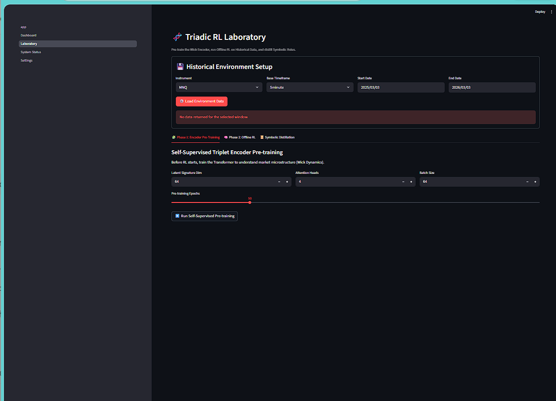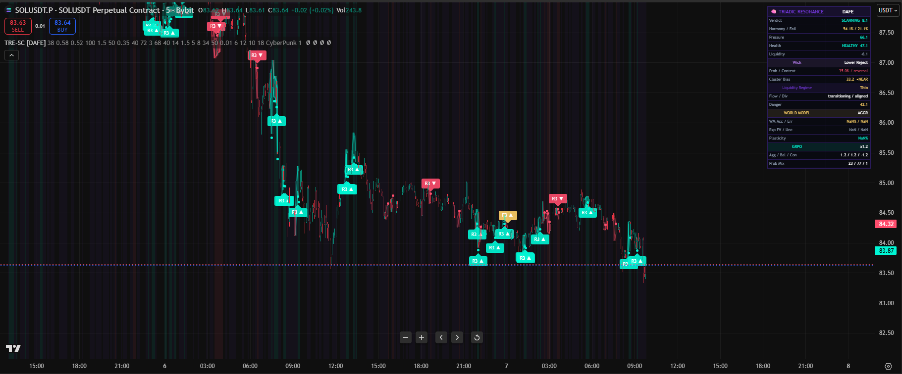 A three‑pillar market intelligence system that fuses Pressure (wick/order intent), Health (trend efficiency & participation), and Liquidity (flow & microstructure) into a single triadic verdict—enhanced by a self‑learning world model with imagined future paths to adaptively classify resolves, traps, and third‑push fakes in real time..